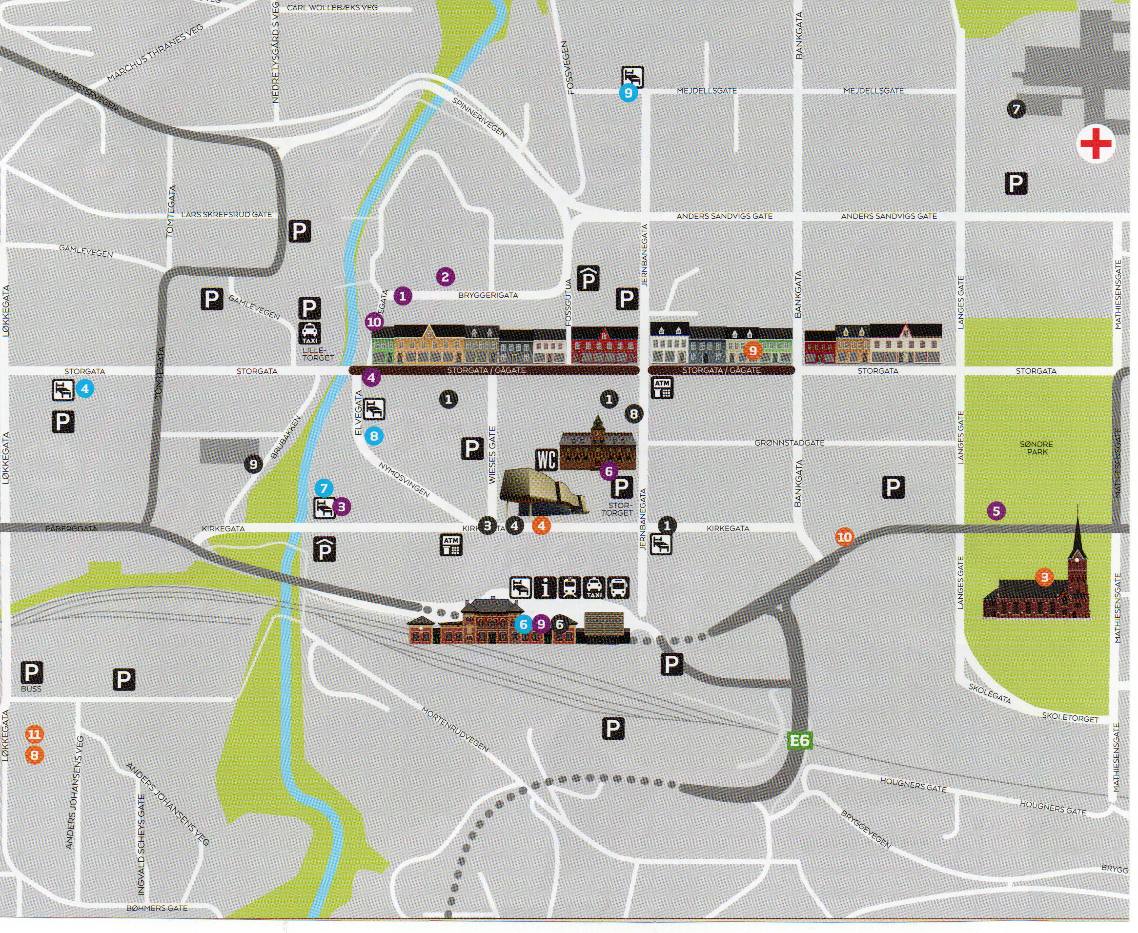 Her kan dere skrå nedover i Søndre Park, eller følge Storgata nordover. Den går over i Gågata lenger nord.